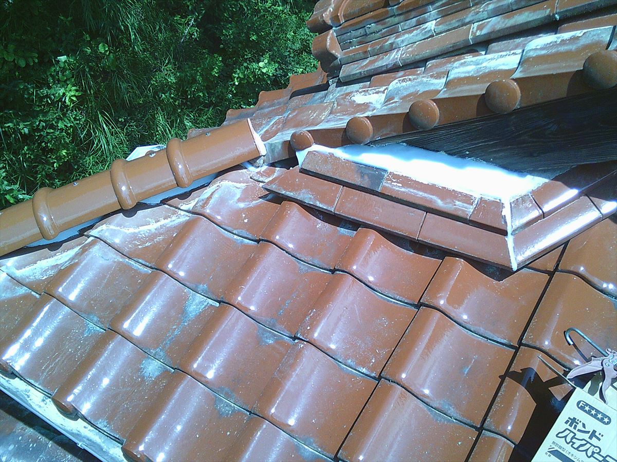 既存の棟をすべて撤去し、新たに7寸丸冠1本伏せで施工しています。